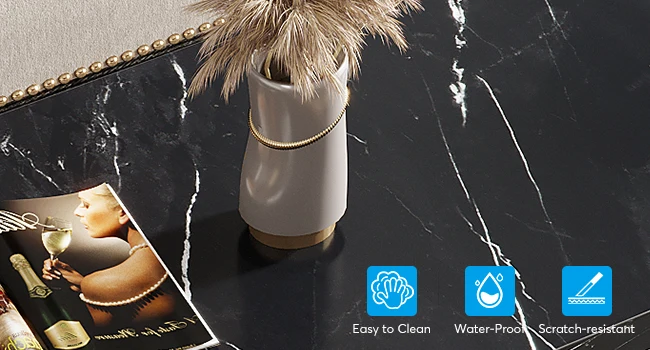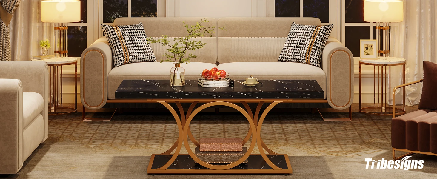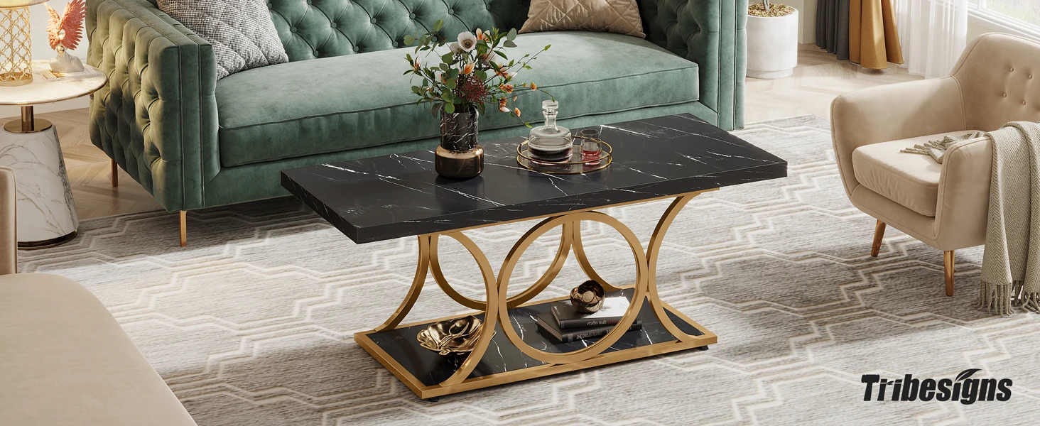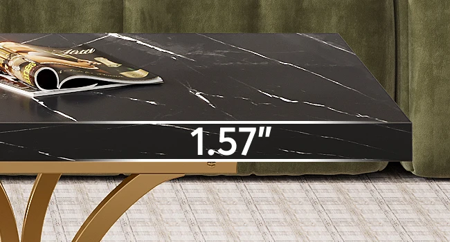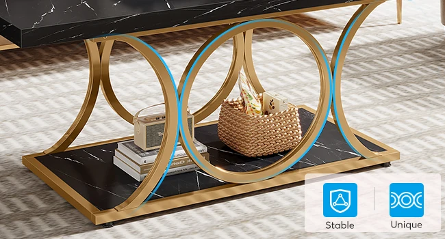 [Sophisticated Modern Coffee Table]: With a cultured black marble veneer top and gold geometric metal legs, adding a touch of modern luxury to the entire coffee table, create a cozy, warm feel in your living space.