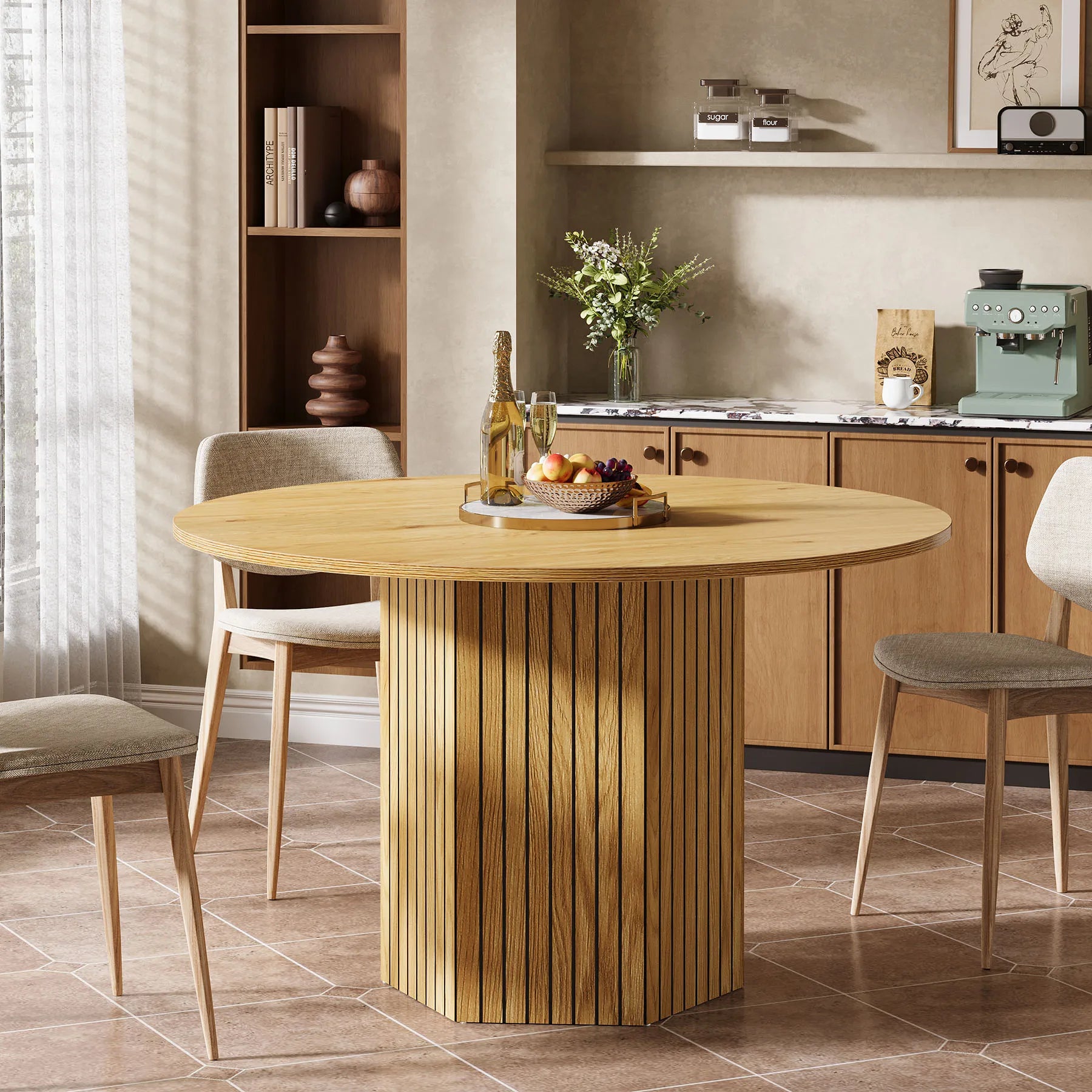 Classic Round Design for Comfortable Dining: The Tribesigns Wood Dining Table features a 47-inch round surface, providing adequate space for up to four people to dine. With this comfortable seating arrangement, everyone at the table can engage in conversation, making meals a more convivial experience. Its classic round design and light brown finish make it an attractive centerpiece in your dining room or kitchen