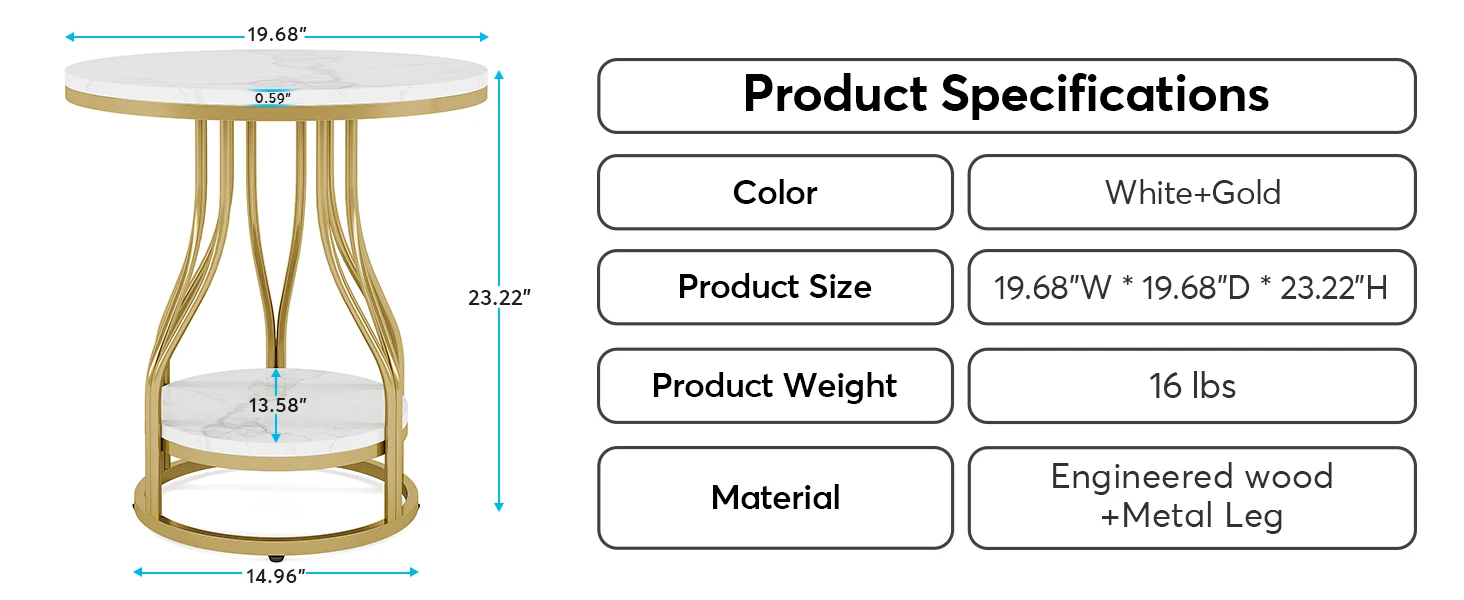 [ Practical and Multi-Purpose ]- Overall Size: 19.68"W *23.22"H. Weighing just the right amount, Tribesigns white gold side table is easy to move and reposition according to your needs. Can easily blend with other furniture in the living room, hallway, bedroom enhancing your house style. It can be a round gold nightstand, end table with storage, accent table snack table, small white gold coffee end table