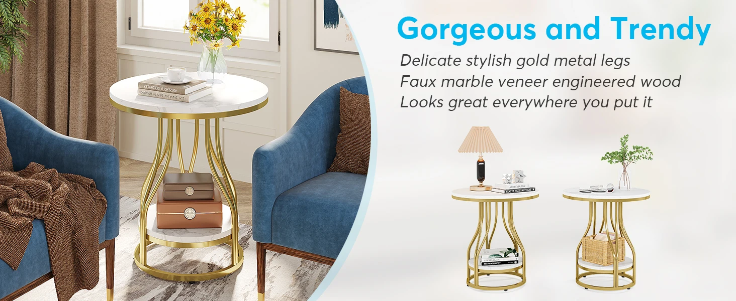 [ Modern Design ]- Tribesigns 2 Tier faux marble white and gold end table round side table is a beautifully designed that will add a touch of elegance to any room. With its sleek lines and delicate details, It is the perfect accent gold end table to complement any interior decor style