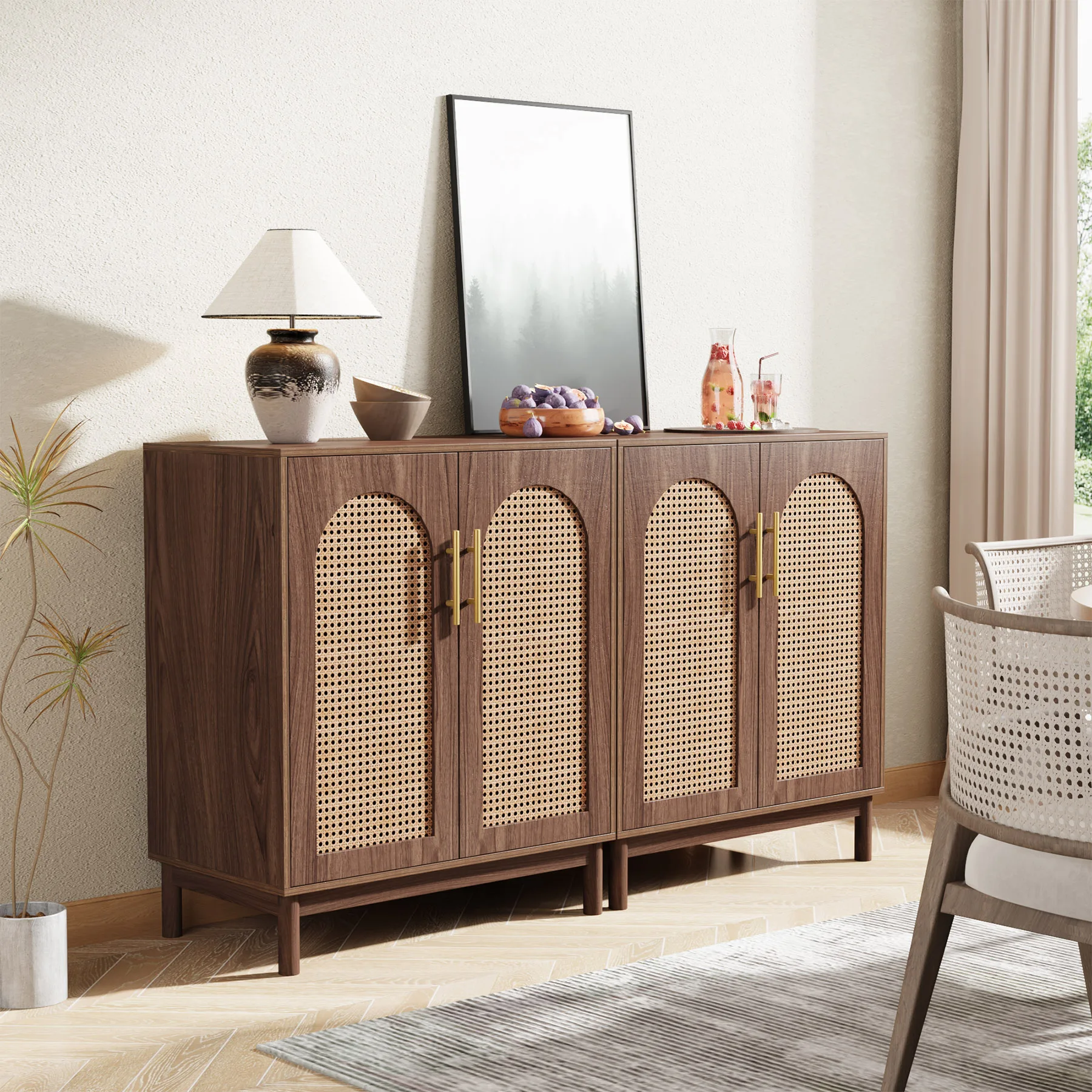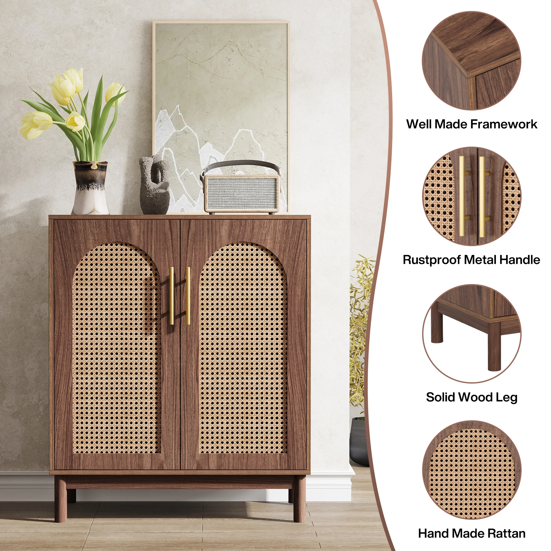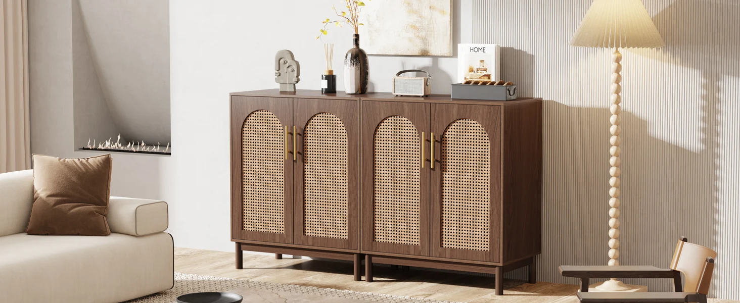 Made from top-tier natural materials, the delicately woven door highlights the cabinet's texture and exudes an air of opulent elegance;