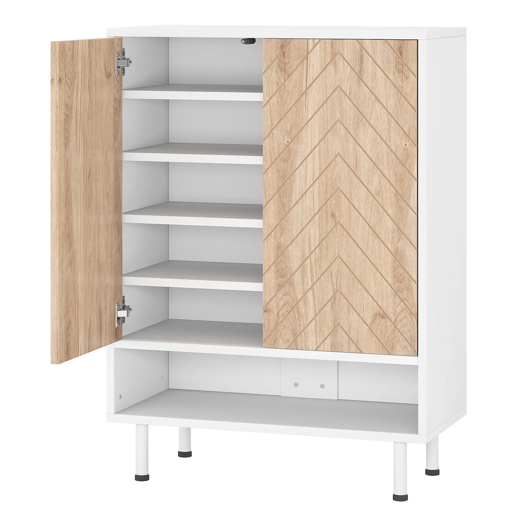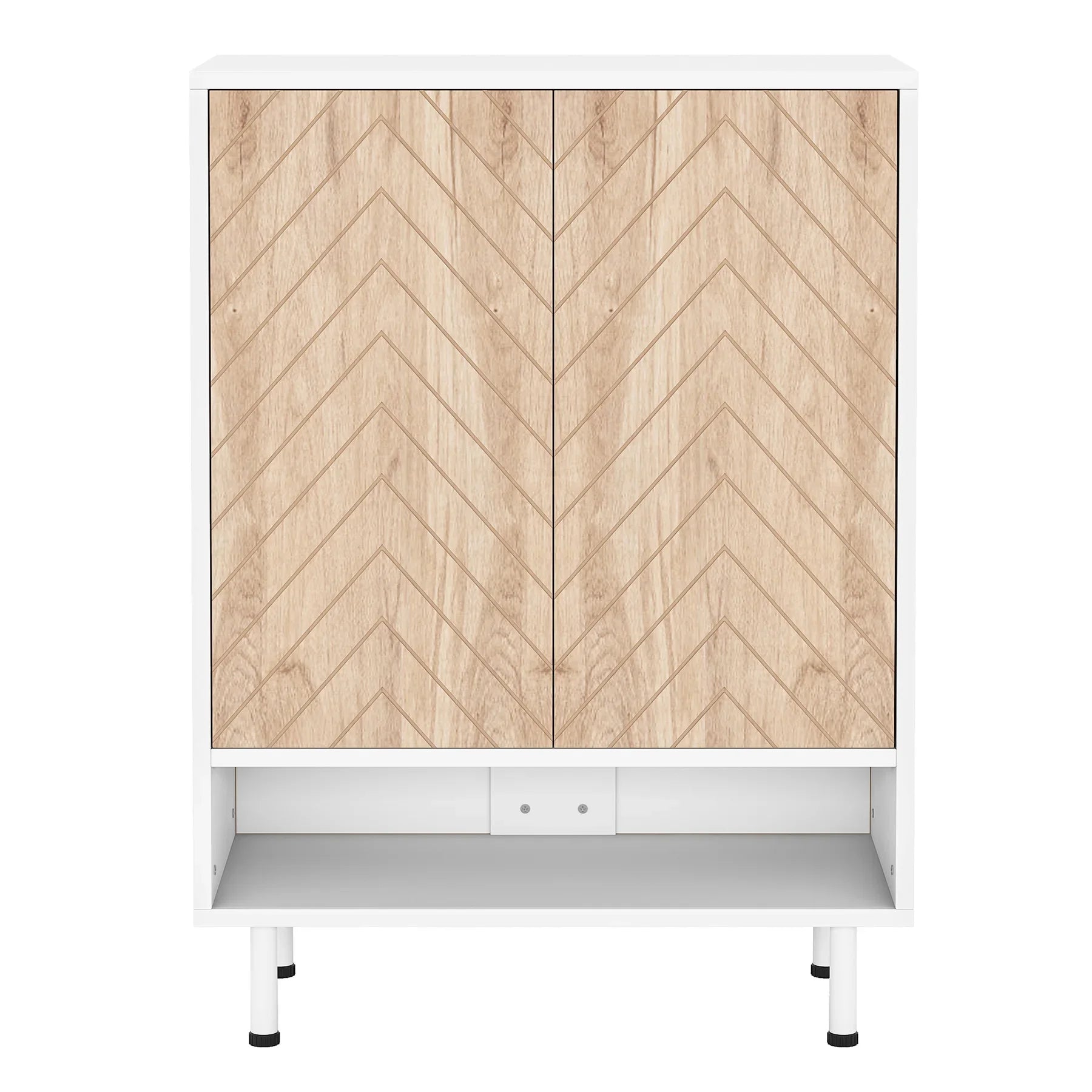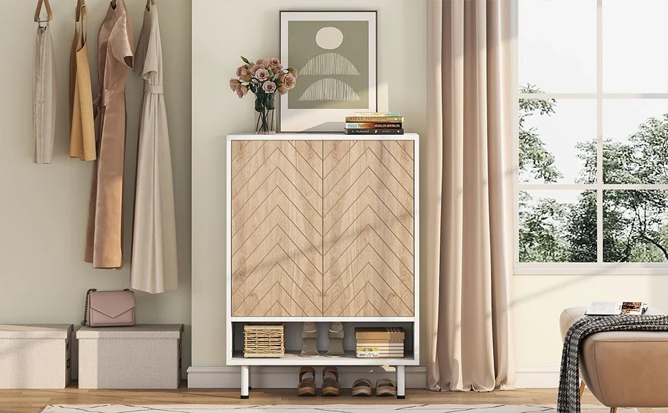 Rustic Modern Shoe Cabinet - Modernist or love an industrial twist? Try our shoe organizer! Rustic wood doors with beautiful herringbone design meet the clean white frame that makes a statement in your space while making your future guests a "wow!" This shoe storage brings sleek style and smart storage to your entryway, bedroom, or dressing area.
