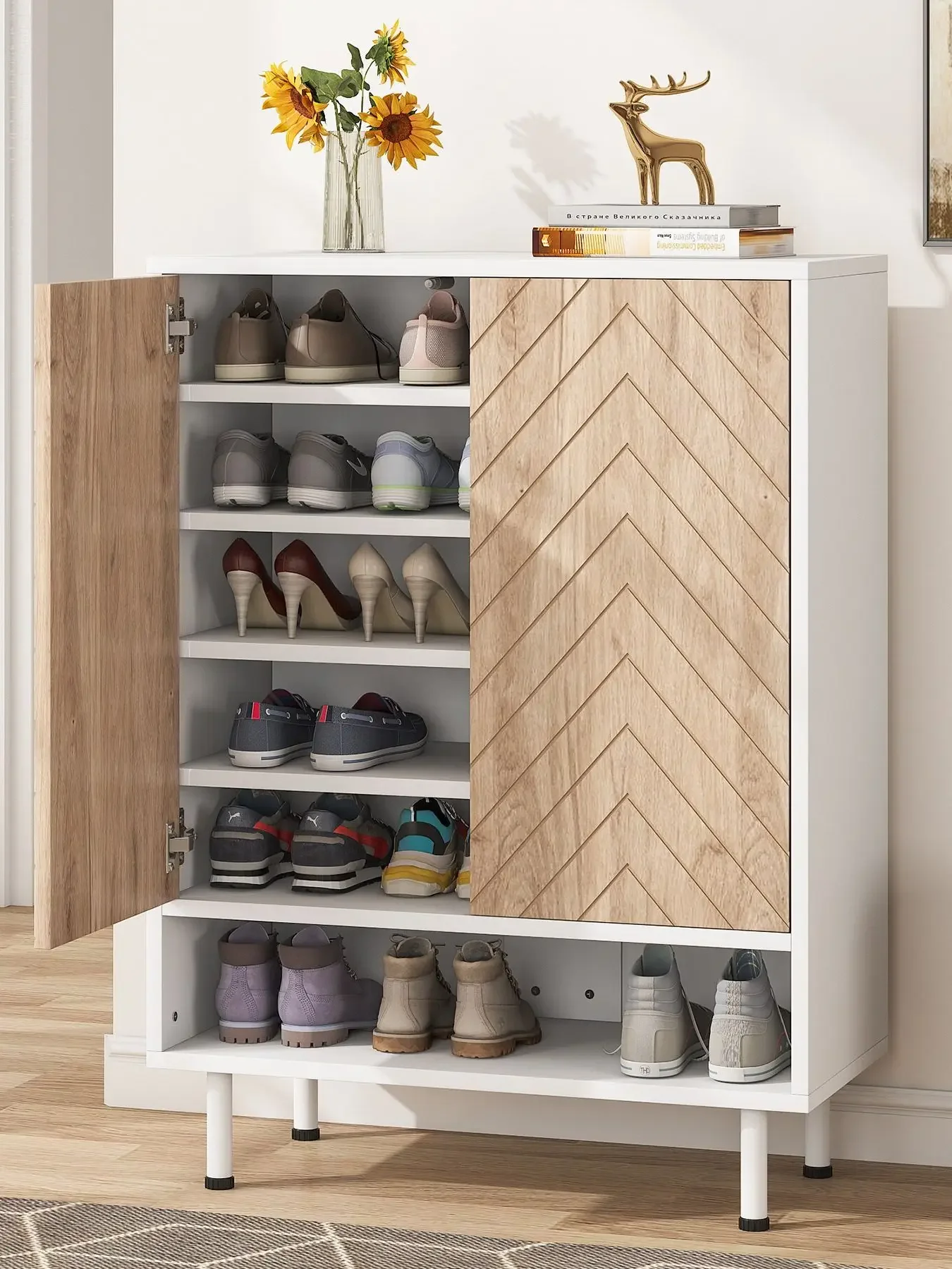 Ample Storage & Hide Clutter - No storage space? this is it! 5 tier hide shelf and open shelf can store up to 18-24 pairs(Depending on the height and size of shoes). The top area is ideal for your preferred decorations. The shoe cabinet with a door provides an enclosed space to keep your shoes clean while no piled-up shoes or messy hallway anymore!