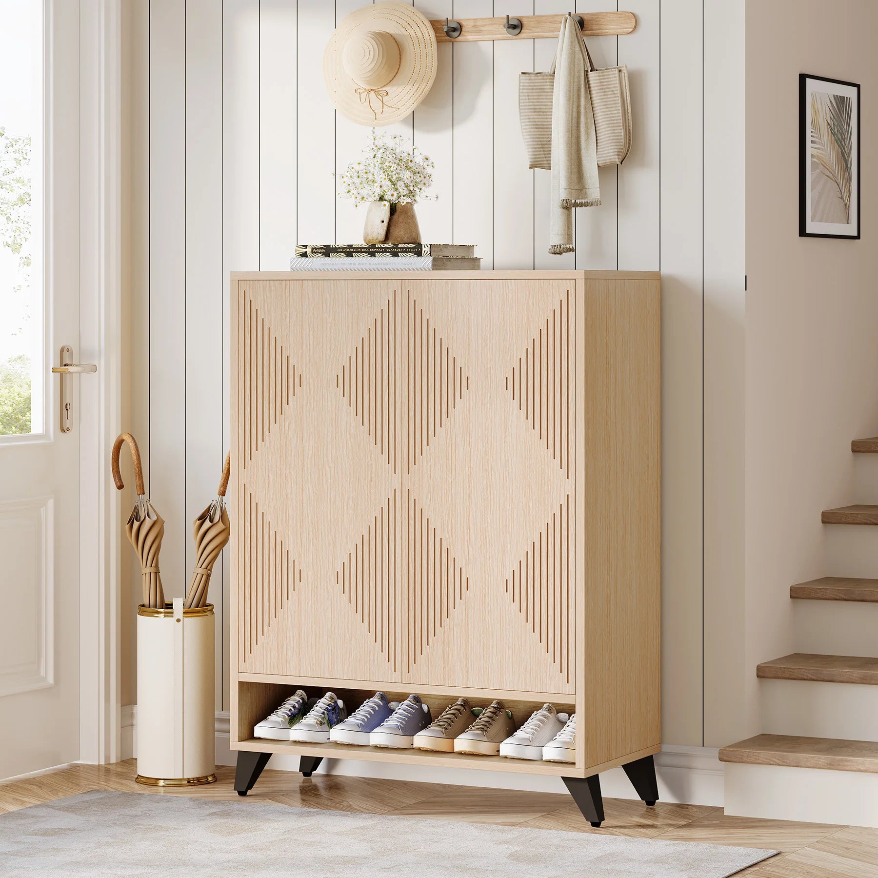 【Distinctive Design】: The entryway shoe cabinet, carefully designed with doors showcasing a carved geometric pattern, infuses a charming element of style into any décor. The ingenious rebound system, an upgrade on traditional handles, ensures a simple, effortless press opens your hidden shoe rack. Enhance your space with this chic shoe organizer cabinet, marrying style and practicality beautifully