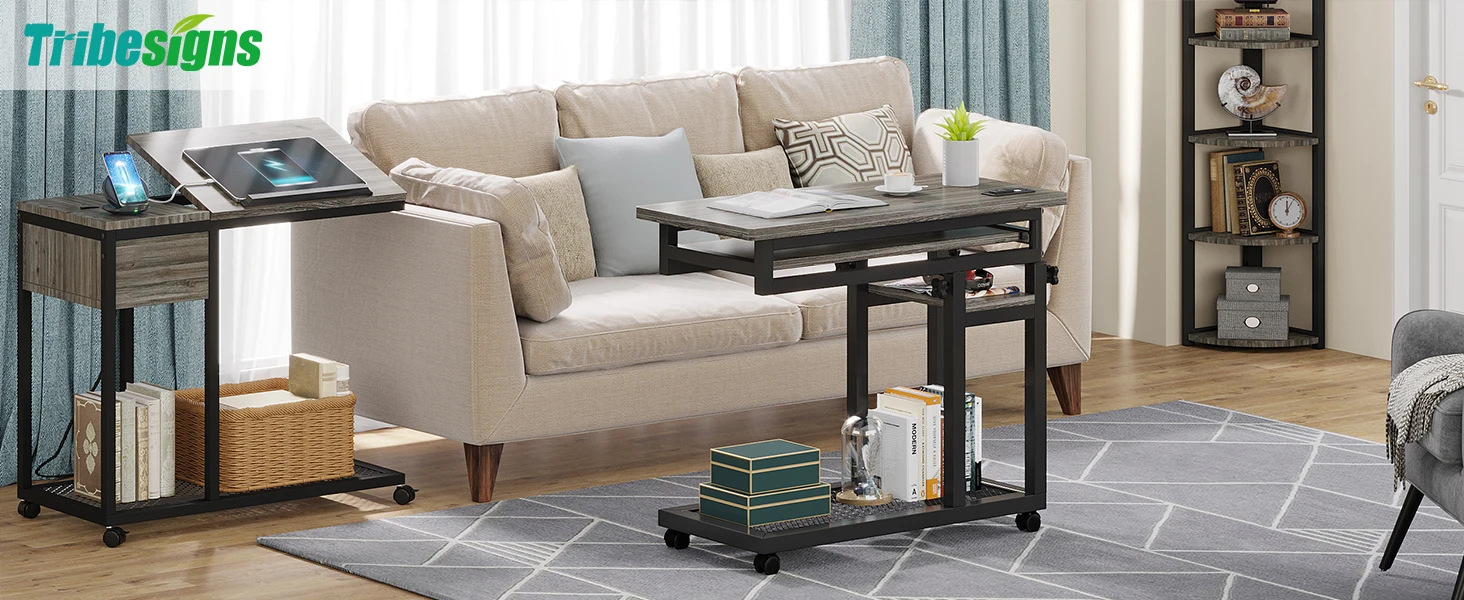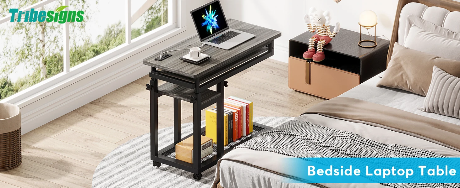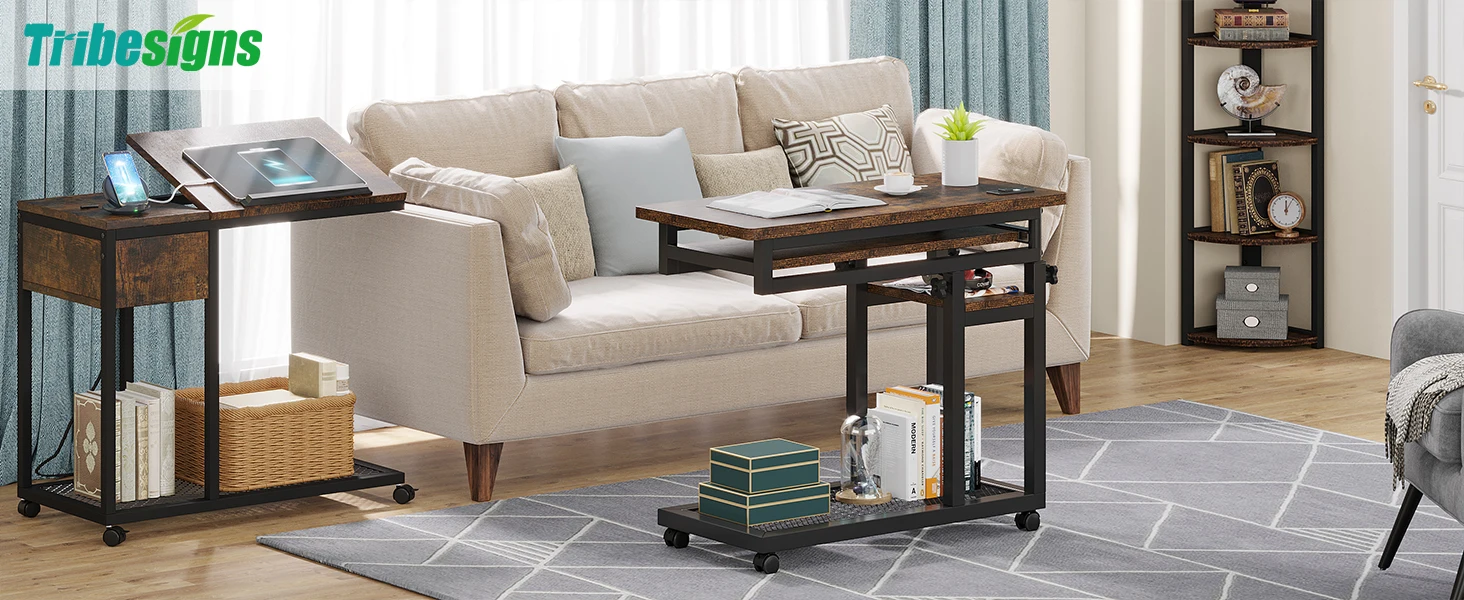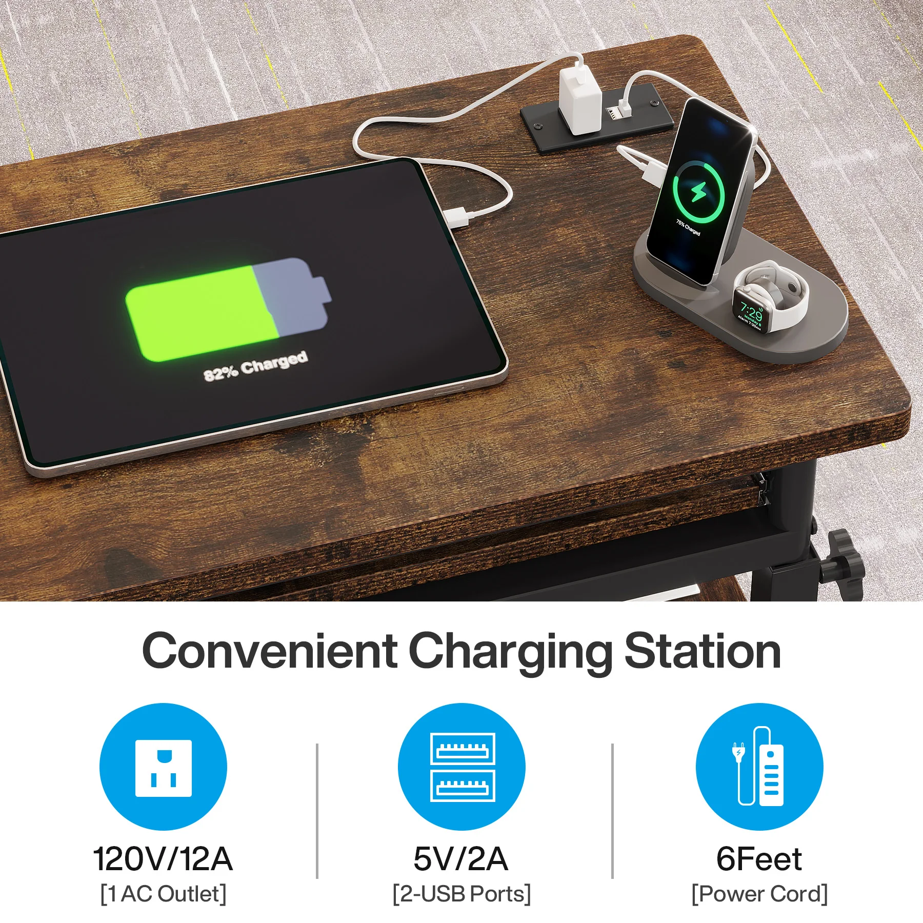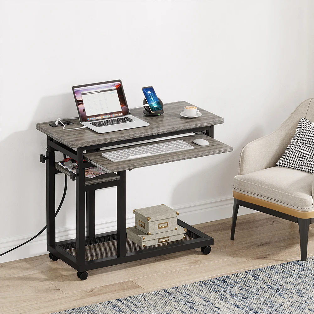 MonoWood Small Portable Desk with Power Outlet, Height Adjustable Sofa Couch Bedside Laptop Table with Wheels