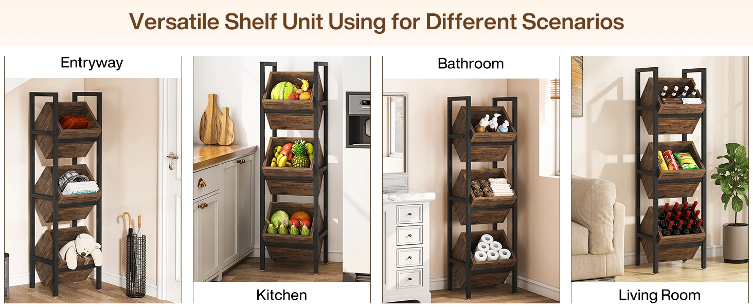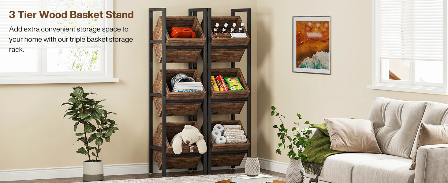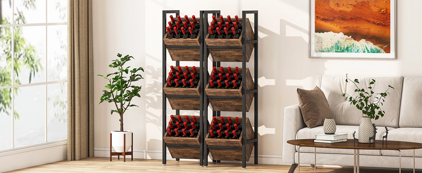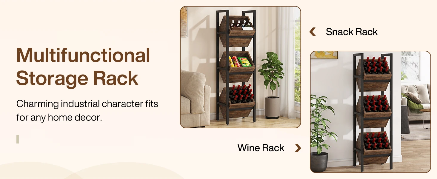 【Large Capacity & Space-saving Design】Measuring 14.57”W x 11.81”D x 51.18”H, this space-saving wine storage stand provides 3 storage basket for up to 36 bottles at an angle for easy access, which can answer all of the needs of home wine bottles storage and make your 'wine area' more tidy. ( Wine Bottles are NOT included. )