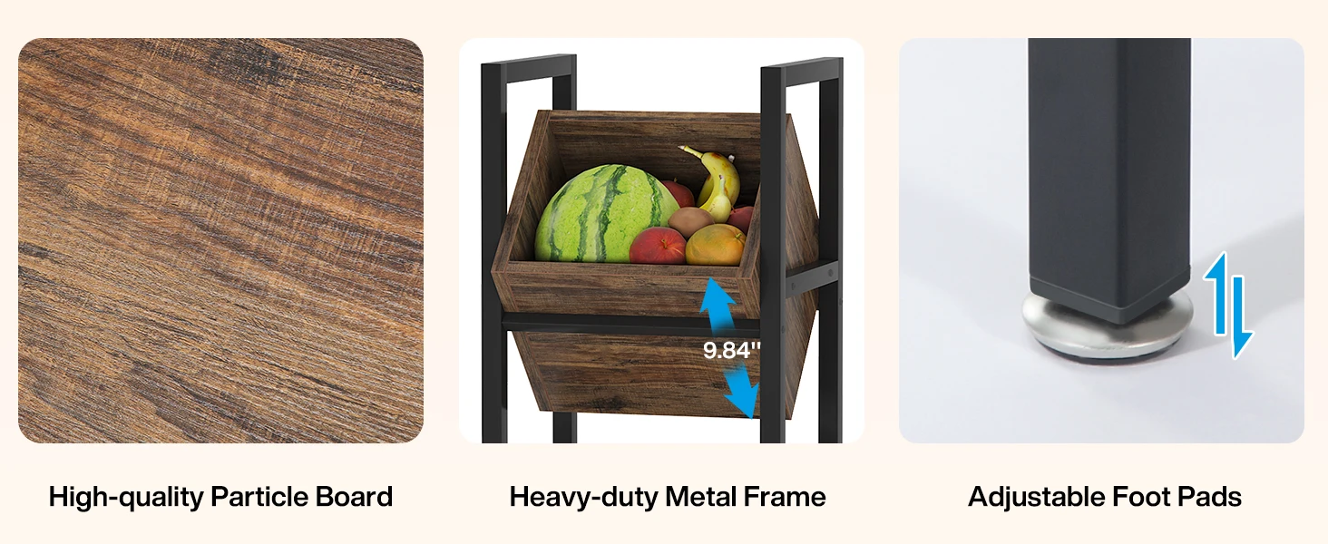 【Wobble-free Structure】Built with reinforced metal frame and high grade particle board, this wood wine bottle organizer is designed to last for years' using with its sturdiness and stability. 4 adjustable feet and wall attachment safety kit for added stability and prevent wine cabinet from wobbling, tilting or falling.